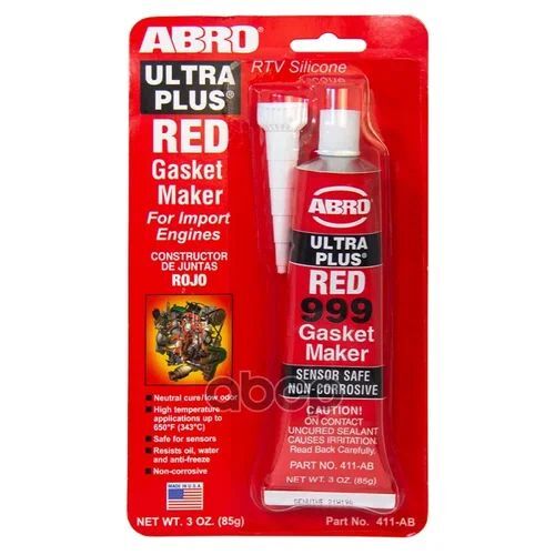 Герметик прокладок ABRO RTV 999 OEM красный Описание: высокотемпературный нейтральный силиконовый герметик прокладок красного цвета. Сфера применения: предназначен для ремонта и замены автомобильных прокладок. Идеально подходит для замены прокладок поддона коробки передач, корпуса термостата, впускного коллектора, поддона картера двигателя, водяной помпы.