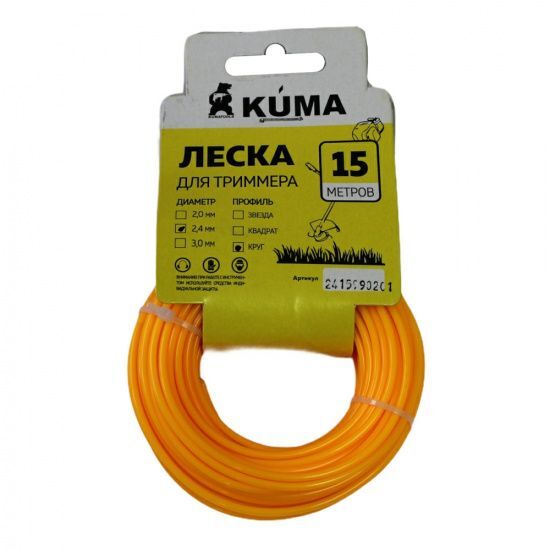 Леска для триммера KUMA, круглая, 2,4 мм, 15 м отлично подходит для качественного покоса травы и используется совместно с триммерами различной мощности в качестве оснастки. Благодаря тому, что изделие выполнено из высококачественного, износоустойчивого материала, оно отличается довольно продолжительным сроком эффективной службы.
