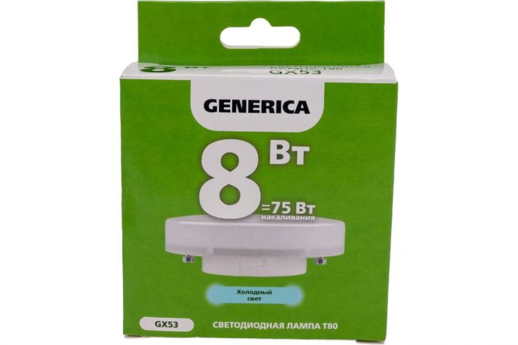 Светодиодная лампа IEK GENERICA T80 в форме таблетки с цоколем GX53 обладает мощностью в 8 Вт. Цветовая температура - 6500К (холодный свет). Изделие рассчитано на использование в сети с переменным напряжением в 220-240В.